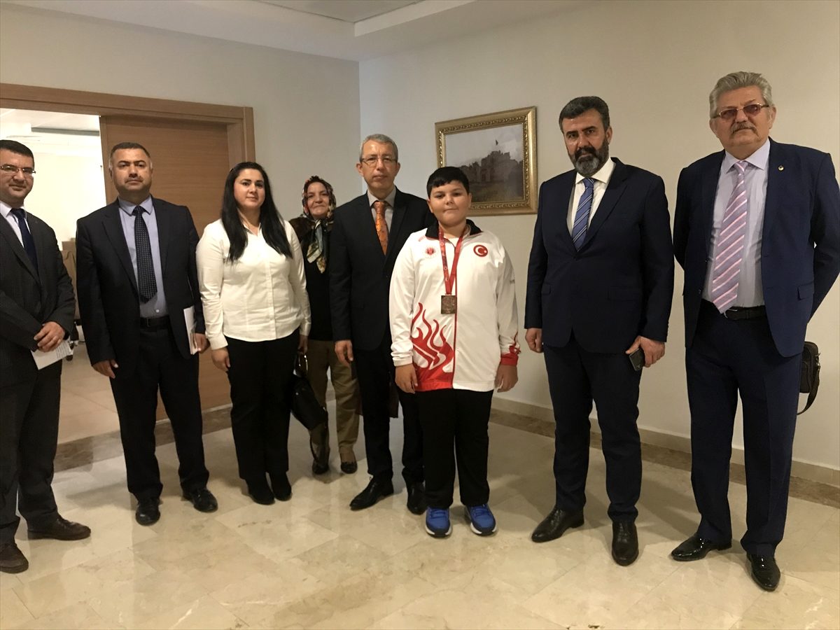 Kara, kabulünde, 11 ülkeden 1050 sporcunun katıldığı şampiyonada, minikler kategorisinde 3. olan Payas Atatürk Ortaokulu öğrencisi Mehmet Kayra Kantaş'ı tebrik etti.
