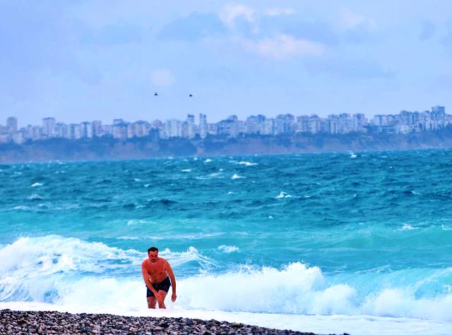 Antalya'da meteorolojinin cumartesi gecesi için saatte 70 ila 100 kilometre hızında fırtına uyarısına saatler kala, rüzgar etkisini göstermeye başladı. Dev dalgaların oluştuğu sahil kesimlerinde Rus bir turist tehlikeye aldırış etmeden denizin keyfini çıkardı.