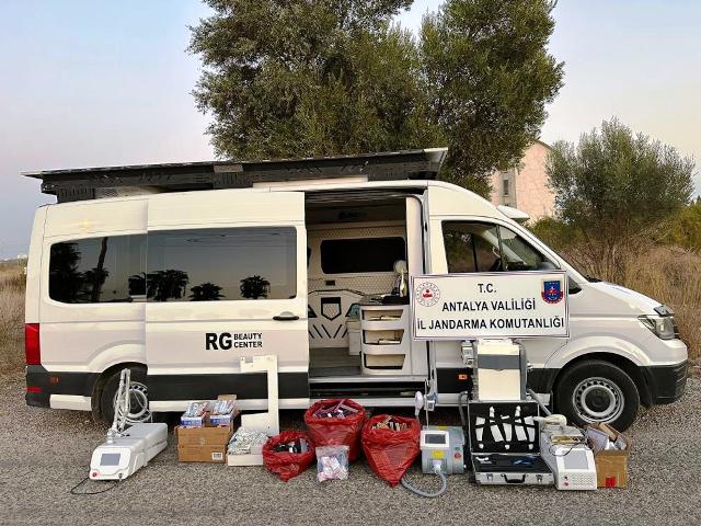 Manavgat’ın Çolaklı Mahallesi'nde Kaçakçılık ve Organize Suçlarla Mücadele (KOM) Şube Müdürlüğü ve Manavgat ilçe Jandarma Komutanlığı ekipleri tarafından yürütülen çalışmalar kapsamında bir şahsın kendisini doktor olarak tanıttığı belirlendi. Şahsın ikametinde ve seyyar olarak VIP araçta güzellik salonunu adı altında botoks, yağ aldırma, yüz gençleştirme ve diş beyazlatma gibi işlemler yaparak insan sağlığını tehlikeye sokacak faaliyetlerde bulunduğu belirlendi. KOM Şube Müdürlüğü, Manavgat İlçe Jandarma Komutanlığı Çolaklı Jandarma Karakolu ve Manavgat İlçe Sağlık Müdürlüğü ekiplerince gerçekleştirilen operasyonda yetkisi ve eğitimi olmadan, kayıt dışı cihazlarla kendisini doktor olarak tanıtarak evinde ve mobil VIP araçta operasyonlar yapan Raşit G., VIP aracıyla yakalandı. Şüphelinin VIP aracında yapılan aramada piyasa değeri 2 milyon 500 bin TL civarında olduğu tahmin edilen; kaçak botoks ilacı, enjektör, kayıt dışı tıbbi cihazlar ele geçirildi. Jandarma tarafından gözaltına alınan Raşit G.'nin dolandırıcılık, basit yaralama, kasten yaralama ve 1219 Sayılı Kanuna Muhalefetten suç kaydının bulunduğu belirlendi. Gözaltına alınan şahıs işlemleri için karakola götürüldü. Karakolda işlemleri tamamlanan şüpheli, gece saatlerinde adliyeye sevk edildi. Şüphelinin adliyedeki işlemlerinin devam ettiği bildirildi. VIP aracında yapılan işlemlerin kurulan bir internet sitesinden de paylaşıldığı öğrenildi. – İHA