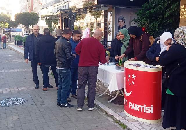 Saadet Partisi (SP) Alanya İlçe Teşkilatı tarafından Necmettin Erbakan’ın vefatının 14’üncü yıl dönümü nedeniyle vatandaşlara tatlı dağıtıldı. Parti binası önünde düzenlenen etkinliğe SP Alanya İlçe Başkanı Hüseyin Sarıca, SP Alanya Kadın Kolları Başkanı Rukiye Gülşen ile partinin yönetim kurulu üyeleri katıldı. Tatlı dağıtımı öncesi konuşan Sarıca, “Necmettin Erbakan’ın vefatının 14’üncü yıl dönümünde dualarla anıyoruz. Ülkemizin her yerinde bugün itibarıyla tatlı ikramıyla insanlarımıza Erbakan hocanın vefat yıl dönümünü hatırlıyoruz. Erbakan hocamız 1969’dan 2011’e kadar 42 yıllık süreçte yapmış olduğu ilkeli siyasetle başımızı hiçbir zaman öne eğdirmedi. Hayra motor, şerre fren oldu. Hiçbir zaman aldatan, aldatan olmadı. Ülkemize 42 yıllık siyasi hayatında yapmış olduğu hizmetlerle 1974’te Ecevit koalisyonunda Kıbrıs çıkartmasını yaparak oradaki Türk kardeşlerimizin zulme uğramasını önledi. Bugün Kıbrıs’taki Türk kardeşlerimiz huzur ve güven içinde yaşıyorsa bunu Kıbrıs çıkartmasına borçlu. Diğer taraftan Erbakan yapmış olduğu ağır sanayi hamleleri ile ülkemizin güçlü bir ekonomiye kavuşmasını sağladı. Savunma sanayinde yapmış olduğu hizmetlerle bugün İHA, SİHA’nın TUSAŞ’taki uçak motorlarının prpjesini geliştiren Erbakan hocamız Türkiye’nin savunma sanayinde güçlü bir yere gelmesini sağladı. Onun 1996’da Refah Yol Hükümeti’nde işçiye, memura, emekliye vermiş olduğu zamlarla bugün işçimiz, emeklimiz, Bağ-Kur’lumuz rahat bir nefes aldı. İnşallah Erbakan hocamızın yolundan gitmeye devam edeceğiz. Onu hayırla anmaya devam edeceğiz. Onun D-8 İslam Birliği Projesi ve Havuz Sistemi Projesi vardı. İnşallah Saadet iktidarında Havuz Sistemi ve D-8 İslam Birliği Projesi ile bu ülkede faizin tamamını ortadan kaldıracağız. D-8 İslam Birliği Projesi ile de bütün dünyada başta Gazze olmak üzere bütün dünyadaki zulmü durduracağız” dedi. Sarıca’nın açıklamasının ardından vatandaşlara tulumba tatlısı ikram edildi. - Erkan Uysal