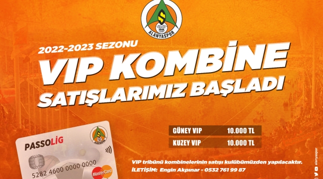 Alanyaspor'un 2022-2023 futbol sezonu VIP kombine fiyatları belirlendi. Güney VIP ve Kuzey VIP tribünü kombineleri 10 bin TL'den satışa sunuldu. Turuncu yeşilli kulüpten yapılan açıklamada şu ifadelere yer verildi: "Futbol severler, 6 Ağustos 2022 tarihinde başlayıp, 28 Mayıs 2023 tarihinde sona eren VIP tribünü kombineleriyle lig maçlarını aynı noktada izleyebilecek. Taraftarlarımızın kombine satın alabilmesi için passolig kartlarına sahip olma zorunluluğu bulunurken, E-Bilet kullanım süresini ise en az 31 Mayıs 2023’e kadar uzatması gerekmektedir. VIP tribünleri kombine satışı kulübümüzden temin edilecektir. Bilgi ve müracaat için Bilet Sorumlumuz Engin Akpınar’a 0532 761 99 87 numaralı telefondan ulaşabilirsiniz."