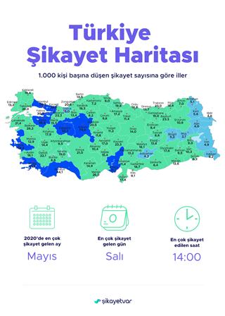 2020 yılını değerlendiren Şikayetvar verilerine göre bu yıl, en çok şikayet mayıs ayında geldi. 2020’de en çok şikayet edilen gün Salı, Türkiye’nin en çok şikayet ettiği saatse 14:00 oldu.