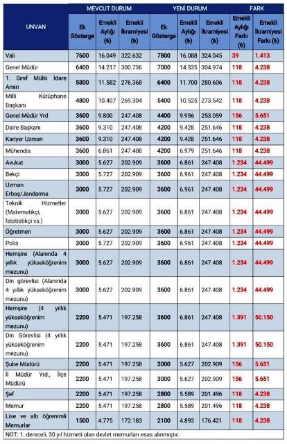 Böylelikle Kamu bürokrasisindeki hiyerarşi ve adalet gözetilerek, ek gösterge sisteminde yeni bir dönem başlayacak ve kamu görevlilerinin emekli aylıkları ile ikramiyeleri esaslı artacak.