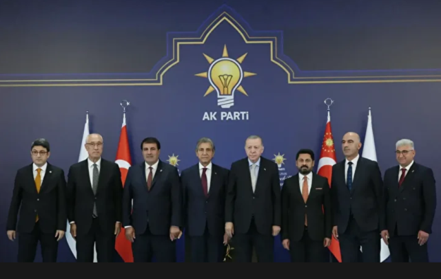 Erdoğan, AK Parti’ye geçen 7 belediye başkanına rozetlerini taktı, hatıra fotoğrafı çektirdi.