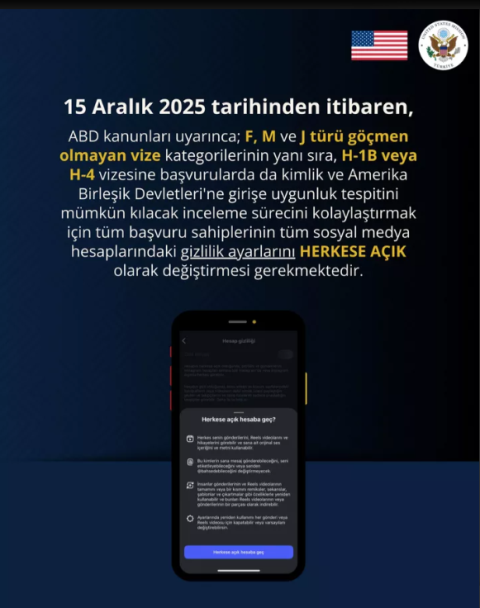ABD'nin Türkiye Büyükelçiliği, bugün yaptığı yeni duyuruda, 15 Aralık 2025 tarihli kararı hatırlatarak, F, M, J vizelerinin yanı sıra H-1B ve H-4 vizesine başvuranlardan tüm sosyal medya hesaplarını herkese açık hale getirmelerinin istenileceğini bildirdi.