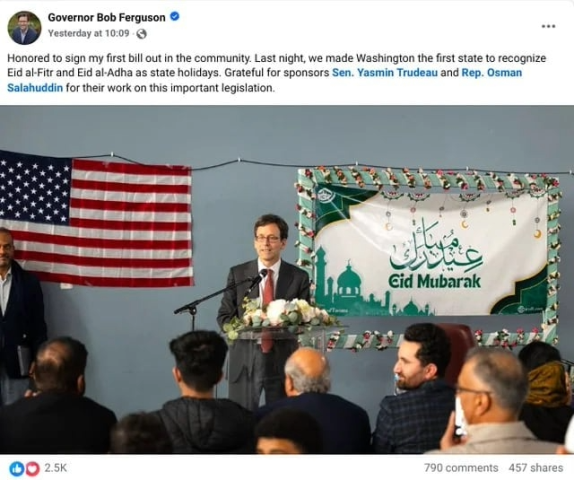 Washington eyaletinin Ramazan ve Kurban bayramlarını resmi tatil olarak tanıyan ilk eyalet olduğunu hatırlatan Ferguson, "Ramazan ayına oruç ve dua ile başlayan binlerce Müslüman Washingtonlıya mübarek olsun. Washington eyaleti, Müslüman topluluklarımızı desteklemektedir" ifadelerini kullandı.