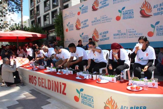 Kumluca’da düzenlenen Tarım ve Seracılık Festivali geleneksel acı biber yeme yarışmasıyla renkli görüntülere sahne oldu. Celal Derin adlı yarışmacı, 3 dakikada 398 gram acı biber yiyerek rakiplerini geride bırakırken, katılımcılar domates, ayran ve suyla acının etkisini hafifletmeye çalıştı.