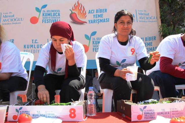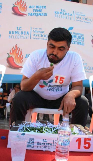 Kumluca’da bu yıl 27’ncisi düzenlenen Tarım ve Seracılık Festivali kapsamında gerçekleştirilen acı biber yeme yarışması büyük ilgi gördü. Kumluca Cumhuriyet Meydanı’nda düzenlenen yarışmada, 3 dakikada 398 gram acı biber yiyen Celal Derin birinci oldu. Geçtiğimiz yıl ikinci olan Derin, bu yıl şampiyonluk hedefiyle katıldığını söyledi.