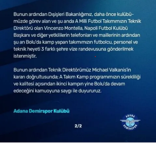 Adana Demirspor Kulübü tarafından yapılan açıklamada, tüm gerekli evrakların hazırlanmasına ve kamp organizatörlerinden Napoli ile Bari takımlarından gelen