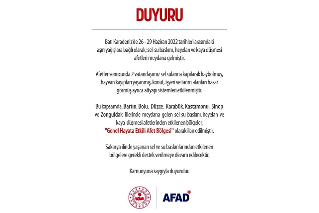 “Batı Karadeniz'de 26-29 Haziran 2022 tarihleri arasındaki aşırı yağışlara bağlı olarak, sel-su baskını, heyelan ve kay düşmesi afetleri meydana gelmiştir. Afetler sonucunda 2 vatandaşımız sel sularına kapılarak kaybolmuş, hayvan kayıpları yaşanmış, konut işyeri ve tarım alanları hasar görmüş ayrıca altyapı sistemleri etkilenmiştir. Bu kapsamda, Bartın, Bolu Düzce, Karabük, Kastamonu, Sinop ve Zonguldak illerinde meydana gelen sel-su baskını, heyelan ve kaya düşmesi afetlerinden etkilenen bölgeler, “Genel Hayata Etkili Afet Bölgesi” olarak ilan edilmiştir. Sakarya ilinde yaşanan sel ve su baskınlarından etkilenen bölgelere gerekli destek verilmeye devam edilecektir.”