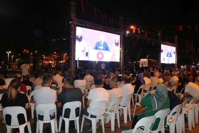 Ardından konuşan Alanya Kaymakamı Şakir Öner Öztürk de, “15 Temmuz tarihte eşi, benzeri görülmemiş, olmamış darbe girişimi ve sadece darbe girişimi değil, ülkeyi bölme, parçalama, cumhuriyeti yok etme, milli egemenliği yok etme girişimidir 15 Temmuz. 15 Temmuz’da ortaya çıkan tablo sadece 2026 15 Temmuz günü bir avuç askerin planlamış oluğu, Fetullahçı Terör Örgütü mensuplarının çok kısa sürede planlamış oluğu bir darbe girişimi değildi. Yaklaşık 50 yıllık bir örgütlenme, ilmek ilmek dokudukları bu devletin, bu milletin imkanlarından faydalanarak elde ettikleri imkanları 50 yıl boyunca hesaplayarak