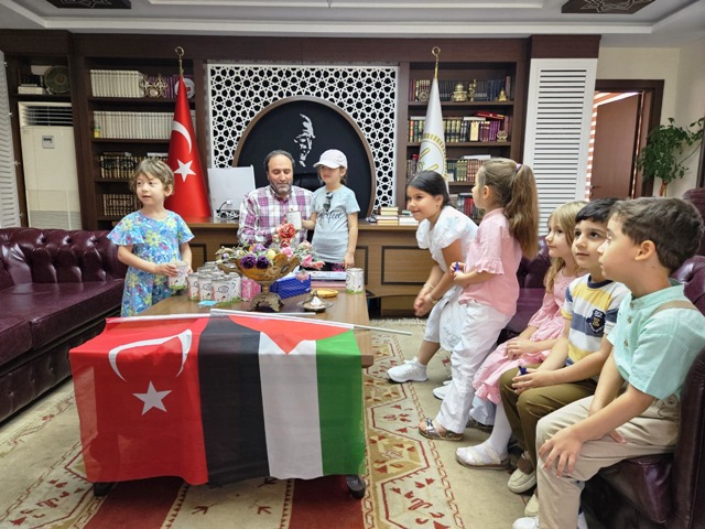 Hz. Hatice 4-6 Yaş Kur’an Kursu öğrencilerinin bağışları, Alanya İlçe Müftüsü Dr. İhsan İlhan’a teslim edildi. Müftü İlhan öğrencileri makamında misafir ederek örnek davranışlarından dolayı tek tek tebrik etti. Ziyaret sırasında İlçe Müftülüğü personeli çocuklara çikolata ikramında bulunarak onların davranışını takdir etti. - Alanya Müftülüğü / Bülten