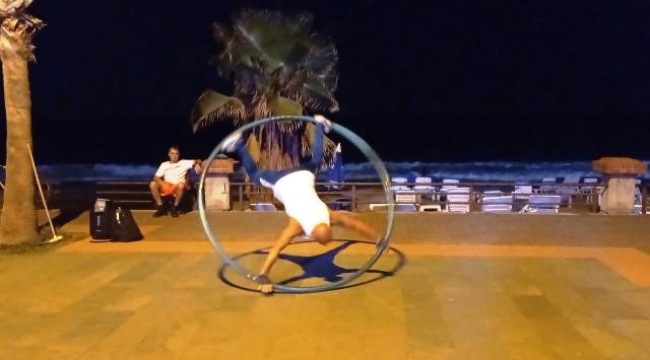 Alanya’da akşam saatlerinde öğretmenevi karşısında yaya ve bisiklet yolunun bulunduğu kısımda bir kişi müzik eşliğinde çember ile akrobatik hareketler yapmaya başladı. Yerli ve yabancı müzikler eşliğinde çember ile akrobatik hareketler yapmaya başlayan kişi birden vatandaşlar ve turistlerin ilgi odağı oldu. Çok sayıda vatandaş ile turist ilgiyle izlediği akrobatik hareketleri yapan kişiyi cep telefonu kamerasıyla kaydetmeyi ihmal etmedi. – Haber Merkezi