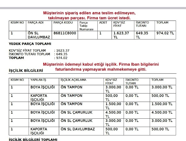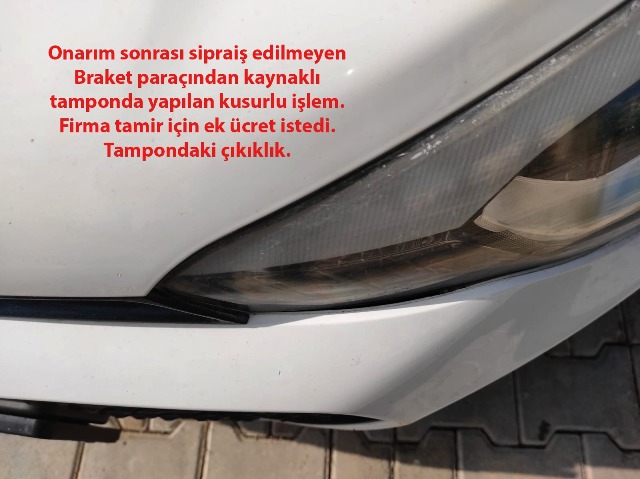 Kazaya karışan araçta sol ön tampon, çamurluk ve davlumbaz bölgesinde hasar meydana gelmişti. Kasko masrafları sigorta şirketi tarafından karşılandı ve ödeme araç sahibinin hesabına yapıldı. Ancak anlaşmalı servis olmayan tamir firması, aracın işlemleri henüz tamamlanmamışken, araç sahibine haber vermeden kasko dosyasını kapattığı iddia ediliyor. Firma, sipariş edilen sol ön davlumbazdaki kırık olan parçayı yenisi ile değiştirmedi ve ön tampon braketi gibi bazı parçaları da hiç talep etmeyerek müşteriye bu konuyla ilgili bir açıklama yapılmadığı iddia ediliyor.