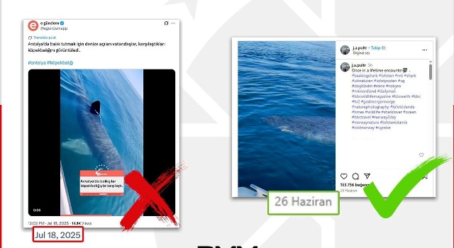 “Bazı sosyal medya hesaplarında video eşliğinde paylaşılan “Antalya’da köpekbalığı görüldü” iddiası dezenformasyondur. Paylaşıma konu videonun Norveçli bir balıkçı tarafından kendi ülkesinde kaydedildiği tespit edilmiştir. Sosyal medyada paylaşılan ve Antalya sahillerinde köpekbalığı görüldüğü iddiasıyla servis edilen görüntü, manipülasyon içermektedir. Bahse konu görüntü, Antalya'da veya Türkiye’nin herhangi bir kıyısında çekilmemiştir. Yapılan incelemede görüntünün, Norveçli bir sosyal medya kullanıcısı tarafından kendi ülkesinde kaydedildiği ve kendi hesabından 26 Haziran tarihinde paylaşıldığı tespit edilmiştir. Aynı videonun üzerine ses eklenerek Türkiye'de çekildiği izlenimi verildiği ve bugün Türkiye’den paylaşıldığı anlaşılmıştır. Antalya Sahil Güvenlik Komutanlığı’nca söz konusu yanıltıcı içeriği üretenlerle ilgili suç duyurusunda bulunulacaktır. Turizm bölgelerimize yönelik turistlerimizin güven duygusunu zedelemek ve ülkemizin turizm potansiyelini hedef almak amacıyla bu tür içerikler kasıtlı olarak dolaşıma sokulmaktadır. Türkiye’nin güvenli bir turizm destinasyonu olduğu gerçeğini gölgelemeye çalışan bu tür dezenformasyon kampanyalarına itibar edilmemesi önem arz etmektedir. Kamuoyuna saygıyla duyurulur.” – Alanya Kaymakamlığı / Bülten