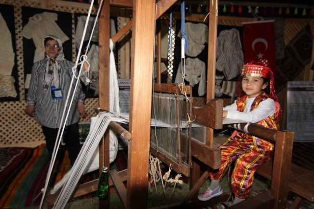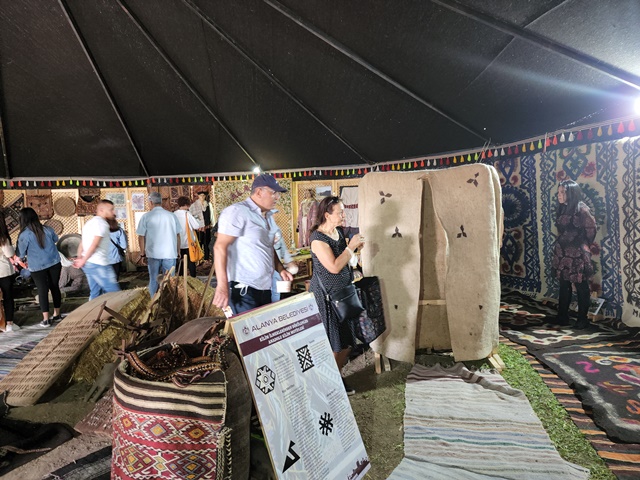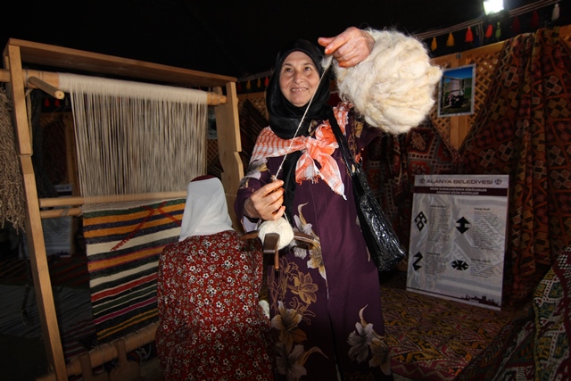 Antalya’nın Aksu ilçesinde düzenlenen ve 6 Mayıs tarihinde açılan Uluslararası Antalya Yörük Türkmen Festivali’ne Alanya Belediyesi de katıldı. 29 ülke, çok sayıda ilçe ve büyükşehir belediyeleri, Yörük dernekleri ve kooperatiflerin katıldığı festivalde, Alanya Belediyesi festivalin en büyük ve en özel çadırıyla yerini aldı. Çadırda Yörük göçünde kullanılan mutfak eşyaları; kazanlar, tencereler, tabaklar, su kapları, hamur tekneleri, ekmek yapmak için kullanılan oklava ve senitler, deve ve eşeklerde taşımacılık için kullanılan heybeler, çuvallar, dokumalar, tarım aletleri; orak ve yabalar, çobanların kullandığı keçe ve kepenekler, rengârenk kilimler, kirmen ve kilim dokuma tezgâhları başta olmak üzere Yörük kültürünü anlatan, besleyen tüm araç ve gereçler Alanya Belediyesi’nin çadırında ziyaretçilere sunuldu. 8 Mayıs’a kadar devam edecek festivalde Alanya Belediyesi’nin çadırını ziyaret eden misafirlere S Pasta ikram edilerek, tezgahlarda dokuma yaptırılıyor ve kirmenle yün eğirtiliyor.