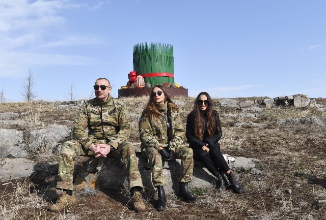 Cumhurbaşkanı İlham Aliyev daha sonra eşi Mehriban Aliyeva ve kızı Arzu Aliyeva ile birlikte Nevruz ateşi önünde ve Cıdır Ovası'nda fotoğraf çektirdi.