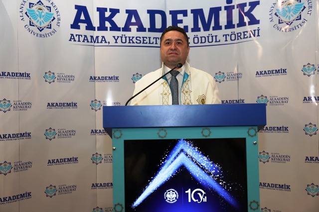Alanya Alaaddin Keykubat Üniversitesi (ALKÜ), akademik başarılarıyla öne çıkan akademisyenlerini yeni ünvanlarla taçlandırmaya ve özverili çalışmalarını ödüllerle onurlandırmaya devam ediyor. ALKÜ Rektörlük Binası Alev Alatlı Konferans Salonu’nda saat 10.00’da başlayan “Akademik Atama, Yükseltme ve Ödül Töreni” bu yıl da coşkulu bir katılımla gerçekleştirildi. Programa; Alanya Belediye Başkan Vekili Sadık Dizdaroğlu, ALKÜ Rektörü Prof. Dr. Kenan Ahmet Türkdoğan Alanya Üniversitesi Rektörü Prof. Dr. Turan Sağer, ALKÜ Rektör Yardımcıları Prof. Dr. Mehmet Kılıç, Prof. Dr. Atıf Bayramoğlu, Prof. Dr. Oğuz Karahan, Genel Sekreter Hüseyin Er, Alanya Eğitim ve Araştırma Hastanesi Başhekimi Doç. Dr. Yılmaz Güler, Alanya Turistik İşletmeciler Derneği (ALTİD) Başkanı Burhan Sili, Alanya Müstakil Sanayici ve İşadamları Derneği (MÜSİAD) Başkan Vekili Hasan Ahlatçı, dekanlar, MYO müdürleri, akademisyenler ve aileleri katıldı. Kariyer basamaklarında ilerleyen ve başarılarıyla üniversiteye değer katan akademisyenlerin onurlandırıldığı törende, bilim yolculuğuna gönül vermiş isimler alkışlarla sahneye davet edildi.