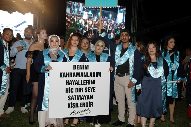 Fakülte ve MYO mezunlarının geçiş töreni ile başlayan 2024-2025 Akademik Yılı Mezuniyet Töreni, 10. yıl dolayısıyla hazırlanan video gösterimiyle devam etti. Öğrenciler, geçiş törenlerinde açtıkları afişlerle hem güldürdüler hem de düşündürdüler. Öğrencilerin geçiş töreni, tribünlerdeki aileleri de gururlandırdı. Aileler öğrencilerin geçişini alkışlayarak izlediler. Üniversite birincisi olan Eğitim Fakültesi Sınıf Öğretmenliği Bölümü’nden Ayşegül Gülmez, konuşma yaparak akademisyenlere ve ailelere bu süreçte verdikleri desteklerden dolayı teşekkür etti. Arkadaşlarına iyi bir gelecek dileyen Gülmez, “Aziz vatanımıza ve milletimize en faydalı bireyler olarak hizmet etmekten gurur duyacağız.” dedi.