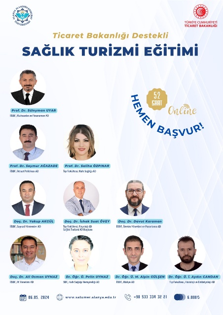 Alanya Alaaddin Keykubat Üniversitesi (ALKÜ) Sağlık Turizmi Uygulama ve Araştırma Merkezi (SATUMER) tarafından sağlık turizmi alanındaki sertifikalı program, Ticaret Bakanlığı ile iş birliği çerçevesinde başlatıldı. Sağlık Turizmi Eğitim Programı, toplam 52 saat ve çevrim içi olarak yapılıyor. Program sonunda yüzde 90 devam koşulunu sağlayan katılımcılar, eğitim programına katıldıkları ve başarılı oldukları takdirde sertifika almaya hak kazanacak. Eğitim kapsamında gerçekleşecek faaliyetler, ALKÜ SATUMER Müdürü ve aynı zamanda Rektör Yardımcısı Prof. Dr. Atıf Bayramoğlu koordinatörlüğünde yürütülüyor. Sağlık turizmi eğitimleri ise sağlık turizmi lisansüstü programlarında ders veren, sektörde tecrübeli akademisyenlerden oluşan kadrolar tarafından gerçekleştiriliyor.