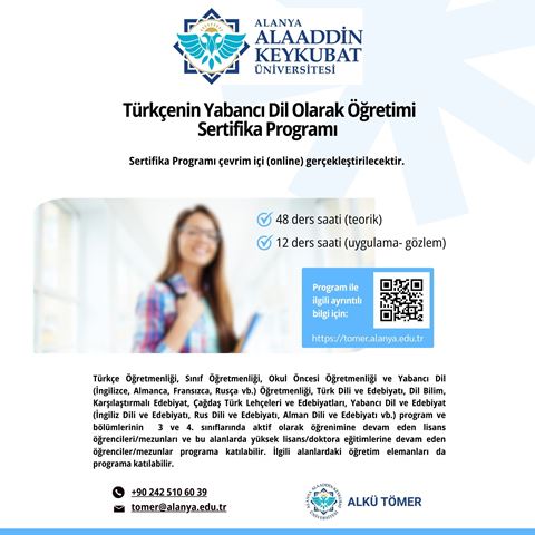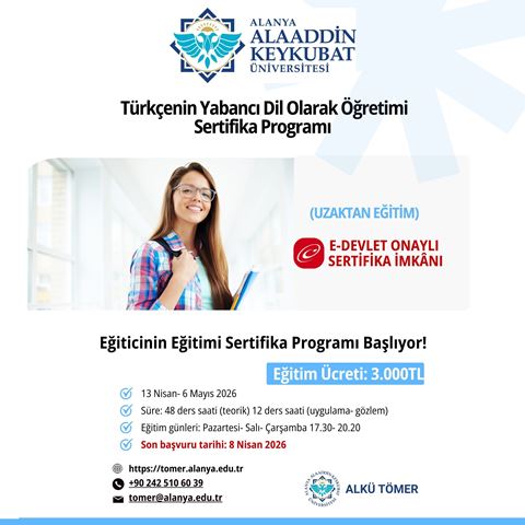 Alanya Alaaddin Keykubat Üniversitesi (ALKÜ) Türkçe ve Yabancı Dil Öğretimi Uygulama ve Araştırma Merkezi (TÖMER) tarafından düzenlenen “Türkçenin Yabancı Dil Olarak Öğretimi Sertifika Programı”, alanında uzman akademisyenlerin katkılarıyla 13 Nisan–6 Mayıs 2026 tarihleri arasında çevrim içi olarak gerçekleştirilecek.