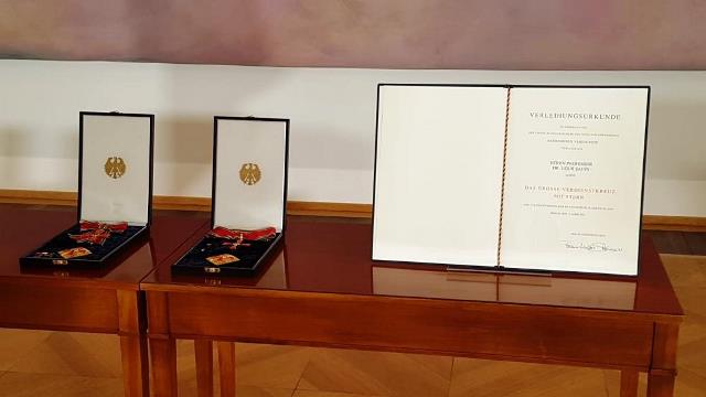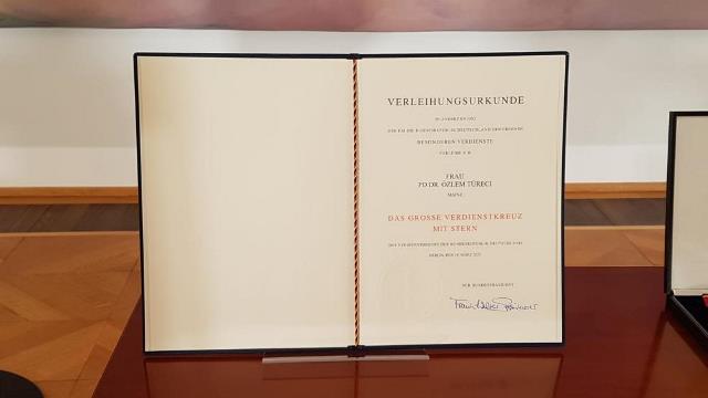 Almanya Cumhurbaşkanı Steinmeier, “Sizler bunu başardınız ve tüm dünyadaki insanlar için bir örnek oldunuz. Bilim adamları olarak, her ikiniz de olağanüstü performans gösterdiniz. Geliştirdiğiniz bu aşı insanlığa bir hizmettir. Bu yüzden bugün buradayız. Madalya ile olağanüstü şeyler başarmış insanları onurlandırıyoruz. Hayatınızı ve şahsiyeti görevine tamamen adamış hayatla işin ayrılmaz bir şekilde bağlantılı olduğu sizin gibi insanla için laboratuvar testi arasında kısa ama hoş bir mola olmuştur. Aşının keşfi ve geliştirilmesi yalnızca bireysel bilim adamlarının performansına dayalı olmadığı gibi sizin kadar seçkin bilim adamlarının keşif ve geliştirme, uluslararası bir araştırma topluluğunun sonucu olması bilim dünyasında, kendi başına harika bir anlam taşıyor” açıklamasını yaptı.