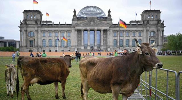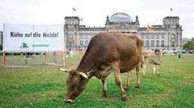 Almanya'nın başkenti Berlin, bugün alışılmadık bir eyleme sahne oldu. Greenpeace ve Kırsal Tarım Çalışma Grubu (ABL), Federal Meclis Binası Reichstag önüne 11 ineği bırakarak ineklerin doğal yaşam alanlarından koparılarak ahırlarda tutulmasını protesto etti. İneklerin habitatlarına uygun yetişmesini isteyen eylemciler, inekleri Reichstag önünde bir müddet otlattı.