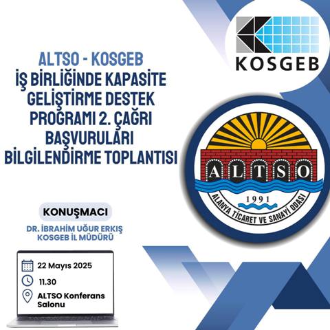 “22 Mayıs 2025 Perşembe günü saat 11.30'da odamız konferans salonunda KOSGEB İl Müdürümüz Dr. İbrahim Uğur Erkış'ın katılımlarıyla Kapasite Geliştirme Destek Programı 2. Çağrı başvuruları hakkında bilgilendirme toplantısı düzenlenecek. İmalat ve yazılım sektörlerinde hizmet veren KOBİ’lerimize yönelik 20 milyon TL kredi üst limitli desteklerinin anlatılacağı toplantıya katılımlarınızı bekler, saygılar sunarız.” – Erkan Uysal