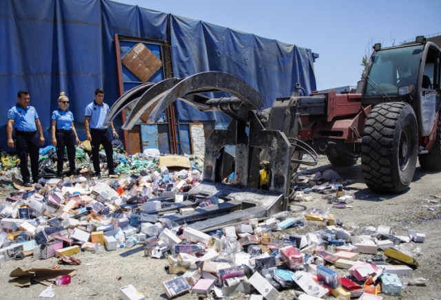 El konulan sahte parfümler, dozerle ezilerek imha edildi.