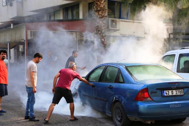 Olay, dün saat 16.30 sıralarında Antalya'nın Muratpaşa ilçesi Altındağ Mahallesi, 159 Sokak üzerinde meydana geldi. Park halindeki 42 D 2788 plakalı aracın motor kısmından dumanlar çıktığını gören vatandaşlar 112 Acil Çağrı Merkezini arayarak durumu bildirdi. İhbarla olay yerine polis ve itfaiye ekipleri sevk edilirken, sokak üzerinde bulunan esnaf ve vatandaşlar ellerine aldıkları su kovaları ve yangın tüpleri ile araca müdahale etmeye çalıştı. Kısa sürede olay yerine gelen itfaiye ekibinin müdahalesi ile yangın kısa sürede söndürüldü. İtfaiye ekibinin araca müdahalesi sırasında araç sahibi aracı park ettiği yere geldi. Kısa sürede önce park ettiği aracının motor kısmının yandığını gören Şemsettin Akyüz isimli vatandaş neye uğradığını şaşırdı.