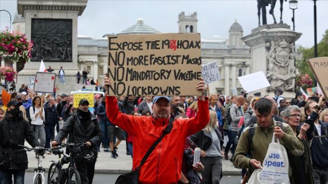 Binlerce kişiyi sokağa döken koronavirüs önlemleri karşıtı protestolara polisin müdahale ettiği kareler İngiltere'nin başkenti Londra'da haber ajansları tarafından kaydedildi.
