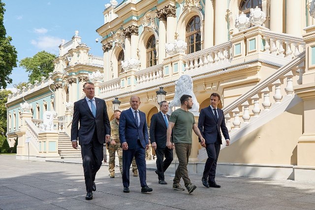 Fransa Cumhurbaşkanı Emmanuel Macron, Almanya Başbakanı Olaf Scholz, İtalya Başbakanı Mario Draghi ve Romanya Cumhurbaşkanı Klaus Iohannis, Ukrayna Devlet Başkanı Vladimir Zelenskiy ile düzenledikleri ortak basın toplantısında, Ukrayna’nın Avrupa Birliği (AB) üyeliğine destek verdiklerini belirtti.