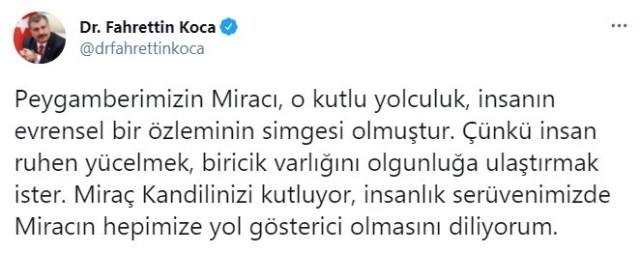 Sağlık Bakanı Fahrettin Koca, "Miraç Kandilinizi kutluyor, insanlık serüvenimizde Miracın hepimize yol gösterici olmasını diliyorum" dedi.