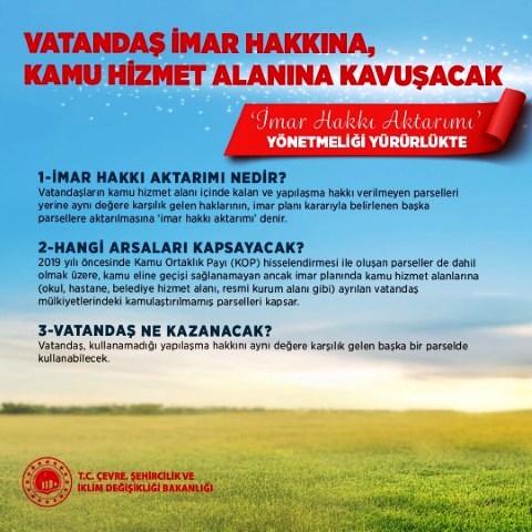 Yapılan düzenleme ile; vatandaşların verilemeyen imar haklarının değeri tespit edilecek, bu değere karşılık gelen hakları, imar planı kararıyla belirlenen alanlara aktarılacak. Uygulama, 2019 yılı öncesinde İmar Planı uygulamaları ile Kamu Ortaklık Payı (KOP) hisselendirmesi ile oluşan parseller de dahil olmak üzere, imar uygulaması marifetiyle kamu eline geçişi sağlanamayan imar planındaki kamu hizmet alanlarına (okul, hastane, belediye hizmet alanı, resmi kurum alanı gibi) ayrılan ancak uzun yıllar vatandaş mülkiyetlerindeki kamulaştırılmamış parselleri kapsayacak.