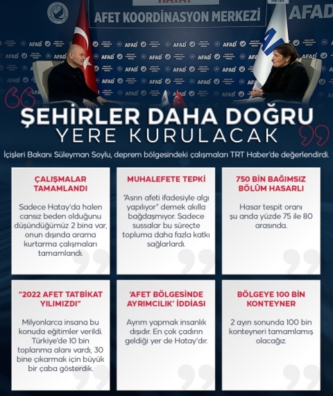 İçişleri Bakanı Süleyman Soylu, "Depremzedelerimiz çok yakında şehirlerinin yeni haliyle kucaklaşacak. Şehirlerimiz daha doğru yerlere kurulacak, çocuklarımız daha güçlü şehirlerde yaşayacaklar. Nasıl bir imtihanla karşı karşıya geldiğimizi biliyoruz ve biz de buradan güçlenerek çıkacağız" dedi.