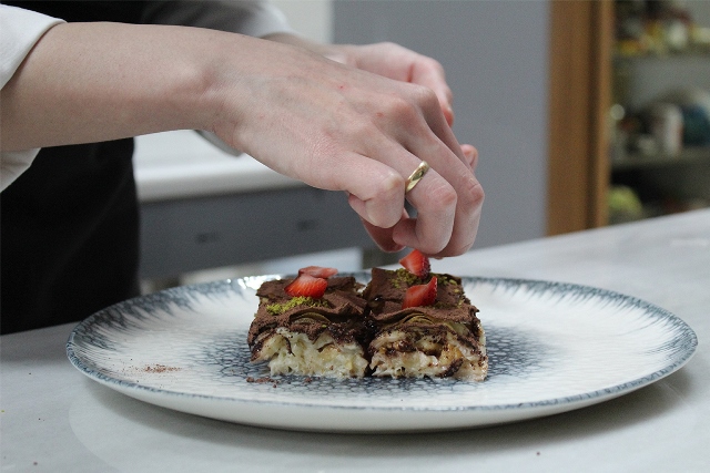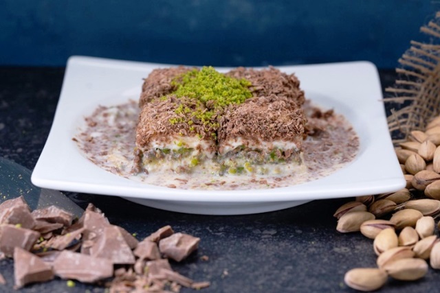 Şerbeti için dikkat edilecek noktalara değinen Özcan, “Süt ve krema bir kabın içinde ocağa alınarak pütürlük olmayana dek karıştırılır. Ardından şeker ilave edilir. Şeker eriyene kadar şerbet karıştırılır. Şerbet asla kaynatılmamalı. Parmağı yakmayacak şeklide ılıtmak yeterli olacaktır. Ilıyan şerbeti kenara alıp, soğumaya bırakıyoruz. Soğuk şerbeti, soğuk baklavaya dengeli bir şeklide ilave ettikten sonra bir saat dinlenmeye bırakıyoruz. Dinlenen baklavanın üzerini elek yardımıyla kakaolu süt tozu ile kaplıyoruz. Antep fıstığı veya Hindistan cevizi ile süsleyerek servis edebileriz. Kakaolu süt tozunun dökümünde de bir püf nokta var. Tarifi deneyeceklere baklava hemen tüketilmeyecekse kakaoyu servis yaptıkça eklemelerini öneriyorum. Çünkü baklava bekledikçe üzerine dökülen kakao ıslanabilir” ifadelerinde bulundu.