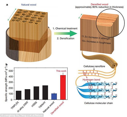 Hu’nun 2017’de Nature dergisinde yayımlanan çalışması, süper ahşabın temelini oluşturdu. Normal ahşap, özel bir kimyasal banyo ve yüksek sıcaklıkta presleme işlemiyle hücresel düzeyde sıkıştırıldı. Bu süreç sonunda, ahşap “çoğu metalden ve alaşımdan daha yüksek dayanıklılık-ağırlık oranına” ulaştı.