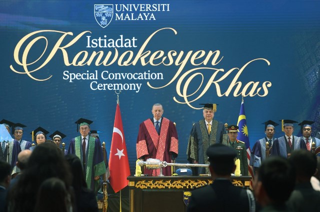 Cumhurbaşkanı Recep Tayyip Erdoğan'a Malezya'da Perak Sultanı Nazrin Şah tarafından uluslararası ilişkiler alanında fahri doktora beratı tevdi edildi.