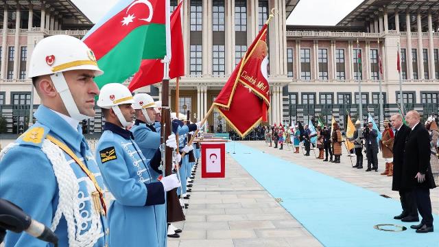 Erdoğan ve Aliyev’in tören alanındaki yerlerini almalarının ardından, 21 pare top atışı eşliğinde iki ülkenin milli marşları çalındı. Aliyev, Muhafız Alayı Tören Kıtası’nı ’Merhaba Asker’ diyerek selamladı. Törende, tarihte kurulan 16 Türk Devletini temsil eden bayraklar ve askerler de yer aldı.