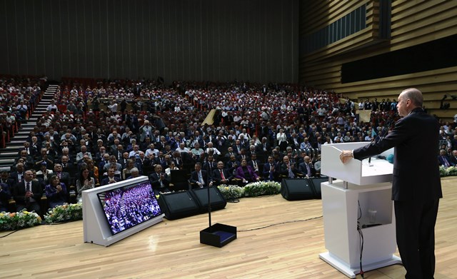 AK Parti kadrolarına hitap eden Cumhurbaşkanı Erdoğan, "Ülkemize ve şehirlerimize kazandırdığımız nice yatırımın mutluluğunu birlikte yaşadık. İnsanlarımızdan aldığımız nice duanın, içimize verdiği huzurla birlikte şahit olduk. Nice badireleri birlikte aştık. Farklı görünümler altında gerçekleştirilen nice saldırılara birlikte göğüs gerdik. Şeytanın bile aklına gelmeyecek yollarla önümüze kurulan nice tuzakları birlikte bozduk. Sıfatlar, görevler, makamlar gelir geçer ama işte bu gurur verici yaşanmışlıklar, hakikatler daima bizimle kalır. AK Parti, belediye hizmetleri ile kendini milletimize ispatlamış, inançlı ve azimli bir kadronun Türkiye'nin yönetimine talip olmasıyla ortaya çıkmıştır. Önce şehirlerimizi değiştirdik, geliştirdik ardından da 81 vilayeti ve bugün 85 milyonu aşan vatandaşıyla tüm ülkede tarihi bir dönüşümü yaşattık. AK Partinin demokrasi ve kalkınma devrimi Cumhuriyet tarihinin en büyük atılımıdır. Geçmişte rahmetli Menderes ve Özal'ın başlattığı reformları çok daha fazlasıyla hayata geçirmek bize nasip oldu" dedi.