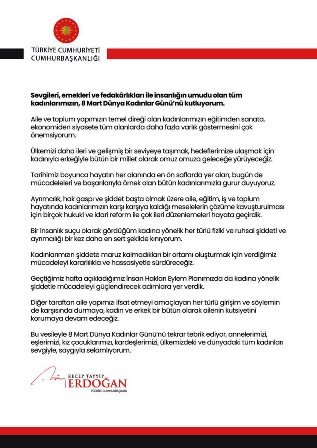 Cumhurbaşkanlığı İletişim Başkanlığı'ndan yapılan açıklamaya göre Erdoğan'ın 8 Mart Dünya Kadınlar Günü mesajı şu şekilde: