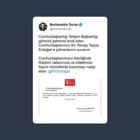 Cumhurbaşkanlığı İletişim Başkanlığı görevine Dışişleri Bakan Yardımcısı Burhanettin Duran getirildi. 9 Temmuz 2025 tarihli ve 2025/246 sayılı Cumhurbaşkanlığı Kararı ile Dışişleri Bakan Yardımcısı Burhanettin Duran, 3 sayılı Cumhurbaşkanlığı Kararnamesi'nin 2 ve 3'üncü maddeleri uyarınca Cumhurbaşkanlığı İletişim Başkanı olarak görevlendirildi.