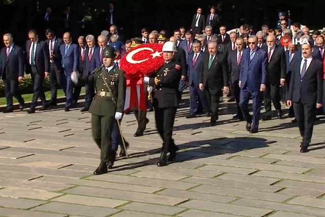 Cumhurbaşkanı Erdoğan'ın Aslanlı Yol'un başındaki yerini almasının ardından başlayan törende, Türkiye Büyük Millet Meclisi (TBMM) Başkanı Mustafa Şentop, Cumhurbaşkanı Yardımcısı Fuat Oktay, CHP Genel Başkanı Kemal Kılıçdaroğlu, MHP Genel Başkanı Devlet Bahçeli, İYİ Parti Genel Başkanı Meral Akşener, Cumhurbaşkanlığı Kabinesi üyeleri, yüksek yargı organlarının başkanları, Genelkurmay Başkanı Orgeneral Yaşar Güler ve kuvvet komutanları da Aslanlı Yol'dan geçerek, mozoleye çıktı. Erdoğan'ın, ay yıldız bulunan çelengi Atatürk'ün mozolesine bırakmasının ardından, saygı duruşunda bulunuldu ve İstiklal Marşı okundu. Ardından Erdoğan ve beraberindekiler, Misak-ı Milli Kulesi'ne geçti.