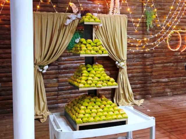 Betül-Yusuf Çiçek çifti düğünlerde pasta yerine baklava kesmeyi tercih etti. 40 yılı aşkın süredir baklava ustalığı yapan Ahmet Çiçek, oğlunun düğünü için dört katlı baklava hazırladı. Salona getirilen baklava davetlilerin alkışları içinde gelin ve damat tarafından kesildi.