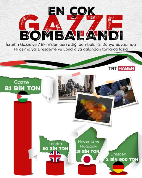 7 Ekim 2023'ten bu yana ise İsrail, Gazze'ye yönelik yoğun hava saldırıları düzenliyor ve bu saldırılar bugüne kadar 81 bin ton bombanın atılmasıyla sonuçlandı. Bu, İkinci Dünya Savaşı'nda Londra, Hiroşima, Nagazaki ve Dresden'e atılan bombaların toplamını kat kat aşan bir yıkımı ifade ediyor.