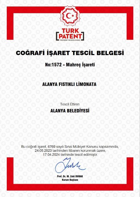 Alanya’nın yaz-kış ayırt edilmeksizin severek tüketilen içeceği ‘Fıstıklı Limonata’ Alanya Belediyesi tarafından yapılan girişimler sonucunda Türk Patent ve Marka Kurumu tarafından tescillendi. Fıstıklı limonata, 24 Mayıs 2023 tarihinde yapılan başvuruda, 6769 sayılı Sınai Mülkiyet Kanununun 41'inci maddesi kapsamında korunmak üzere 17 Nisan 2024 tarihi itibariyle Mahreç İşareti ile koruma altına alındı.