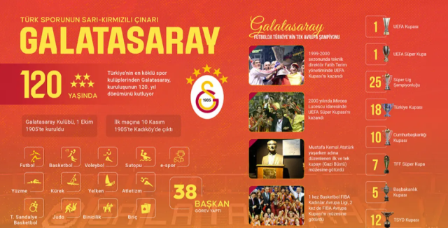 Törende konuşan Başkan Dursun Özbek, Burada 120 yıllık bir çınarın gölgesinde bir okulun duvarlarından filizlenip, bir ulusun gururuna dönüşen Galatasaray Spor Kulübü’nün doğum gününü kutlamak için bir arayız. Doğduğumuz yuvada Tevfik Fikret Salonu’nda Galatasaray’ın ebedi değerlerini yaşatmak için toplandık. Bu yıl sadece yıl dönümünü değil bir dönüm noktasını da kutluyoruz. Futbolda 25. şampiyonluğumuzu kazanarak 5. yıldızı formamıza taşıdık. Bu sadece sportif başarı değil, 120 yıllık istikrarın, çalışkanlığın ve inancın simgesindir. Galatasaray sadece futboldan ibaret değildir. Basketbol, voleybol, yüzme, kürek, yelken, sutopu ve daha birçok branşta onlarca kupa kazanarak Türk sporunun her alanında öncü olmuştur. Dün kulübümüzün manevi mirasını taşıyan Atatürk, Tevfik Fikret ve Ali Sami Yen heykelinin açılışını gerçekleştirdik. Bu heykel sadece üç büyük ismin hatırasını değil, aklın, ahlakın ve inancın birleştiğinde neler başarılabileceğinin de simgesidir" diye konuştu.
