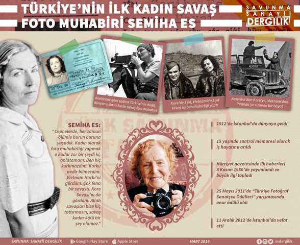 Meslek hayatı boyunca birçok savaş gören ve bunu fotoğraf makinesi ile bizlere aktaran Semiha Es, kimilerine göre sadece Türkiye'nin değil, dünyanın da ilk kadın savaş foto muhabiri.