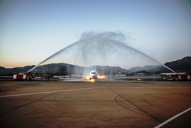 Havacılık geleneği olan su takı ile karşılanan uçakta bulunan yolcular, Alanya Belediye Başkan Yardımcısı Nazmi Yüksel tarafından gülle karşılandı.
