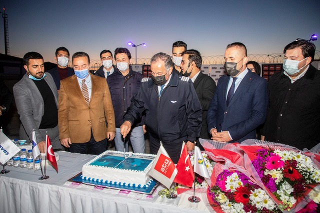 Yolcuların ardından kaptan pilot ve kabin ekibi için de pasta kesilip hediyeler takdim edildi. Kış boyunca haftada 1’i kesin olmak üzere talebe dayalı olarak 2 kez gerçekleşebilecek seferler, yaz döneminde daha da artacak.
